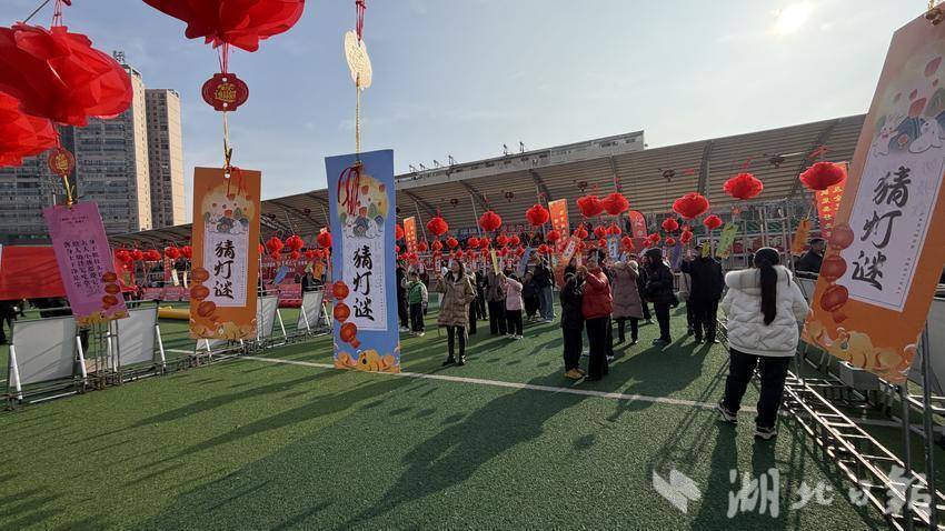 在猜灯谜廊道下,成排的红灯笼高高挂起,五颜六色的谜面纸条随风轻舞。市民三两成群,对着头顶的谜面指指点点、低声推敲;有的紧皱眉头苦思冥想,随后猛拍大腿,欢呼着跑去兑奖,元宵节的文化趣味瞬间拉满。