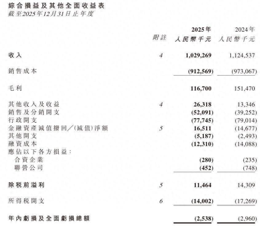 公告显示,公司的收入约为10.29亿元,较截至2024年12月31日止年度的11.25亿元减少8.5%。毛利约为1.17亿元,较上年同期的1.52亿元减少23.0%。年度亏损从截至2024年12月31日止年度的296万元减少14.26%至253.8万元。截至2025年12月31日的资产净值约为17.59亿元,较上年同期的17.53亿元增加0.3%。董事会不建议派付任何股息。